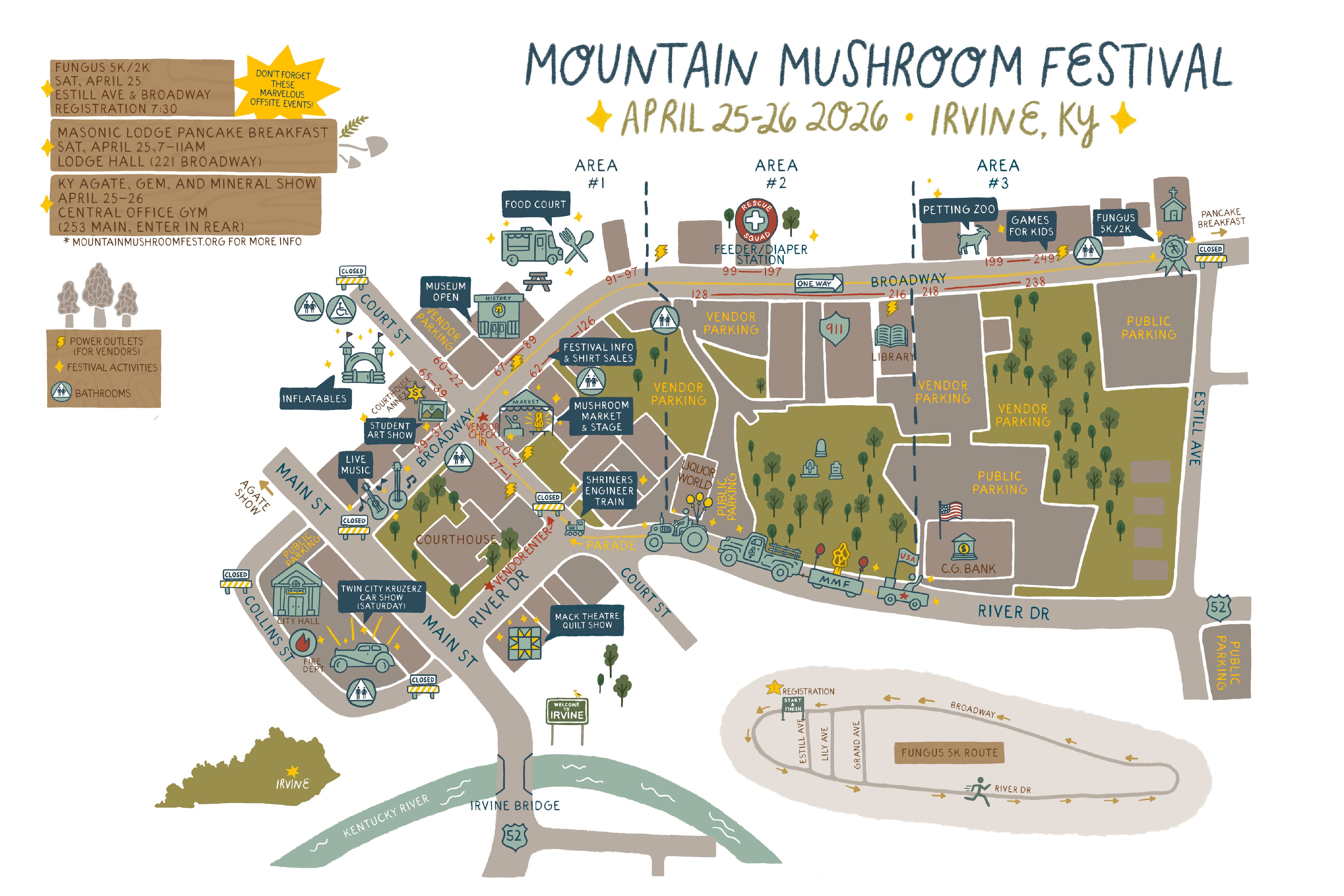 In partnership with the Estill County School System and funding via the Mountain Mushroom festival commitee, we are happy to offer free parking and a free shuttle to the festival!